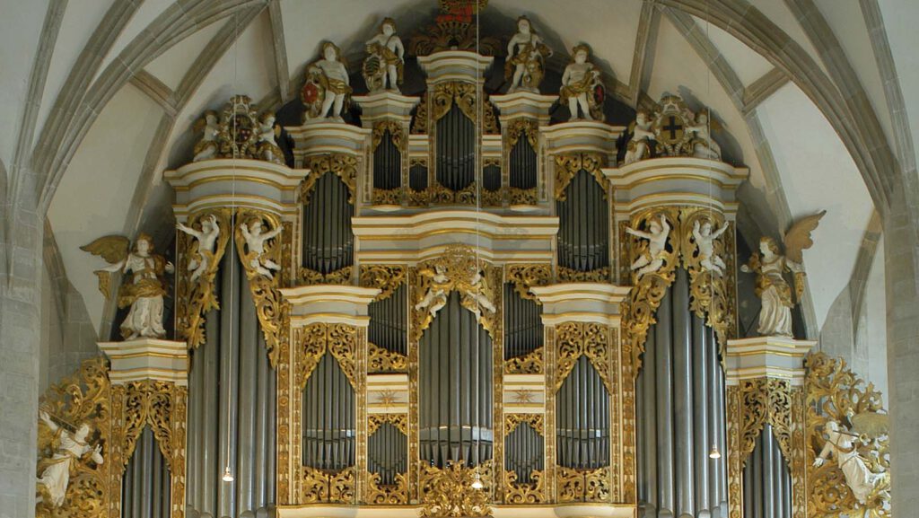 Damals mit großer Selbstverständlichkeit in den spätgotischen Langhausraum eingefügt, als wäre der für ihn gebaut worden – so beherrscht dieser prächtige Barockprospekt noch heute den Dom: Bis ins Gewölbe aufgetürmt, füllt er den Raum zwischen den Türmen, davor schwingt die Musikempore von 1665 bis zu den westlichen Langhauspfeilern vor. Mit reich geschnitzten, solide vergoldeten Akanthuswangen, mit musizierenden Engeln und wappenhaltenden Putten geschmückt, ist diese beeindruckende Orgelwand in ihrer damaligen Form im Wesentlichen bis heute erhalten geblieben.